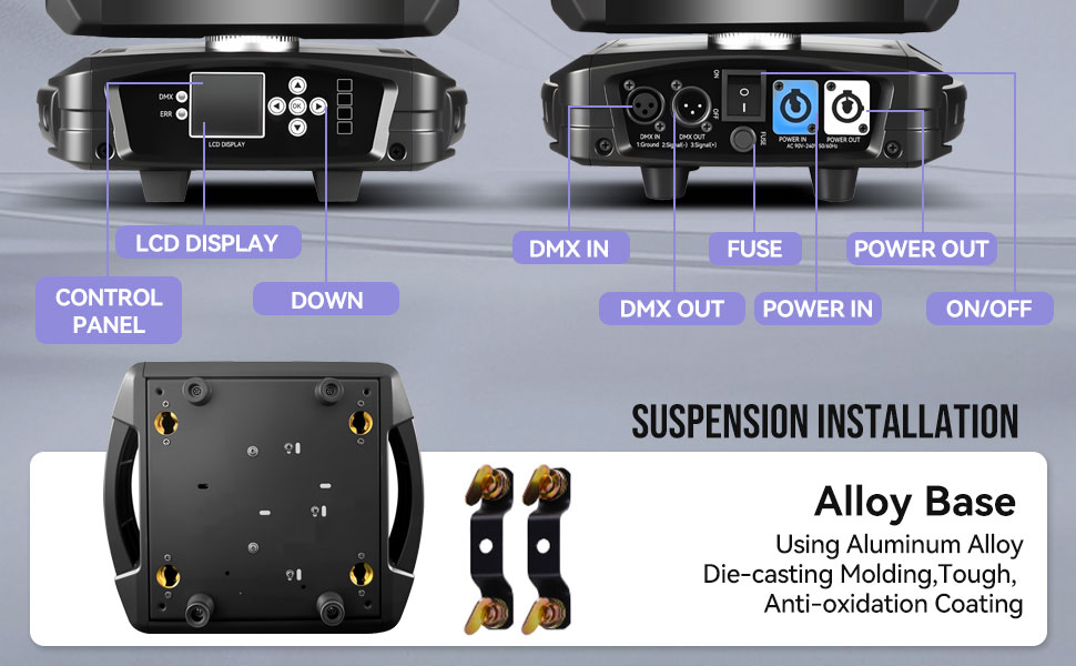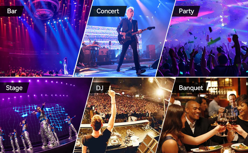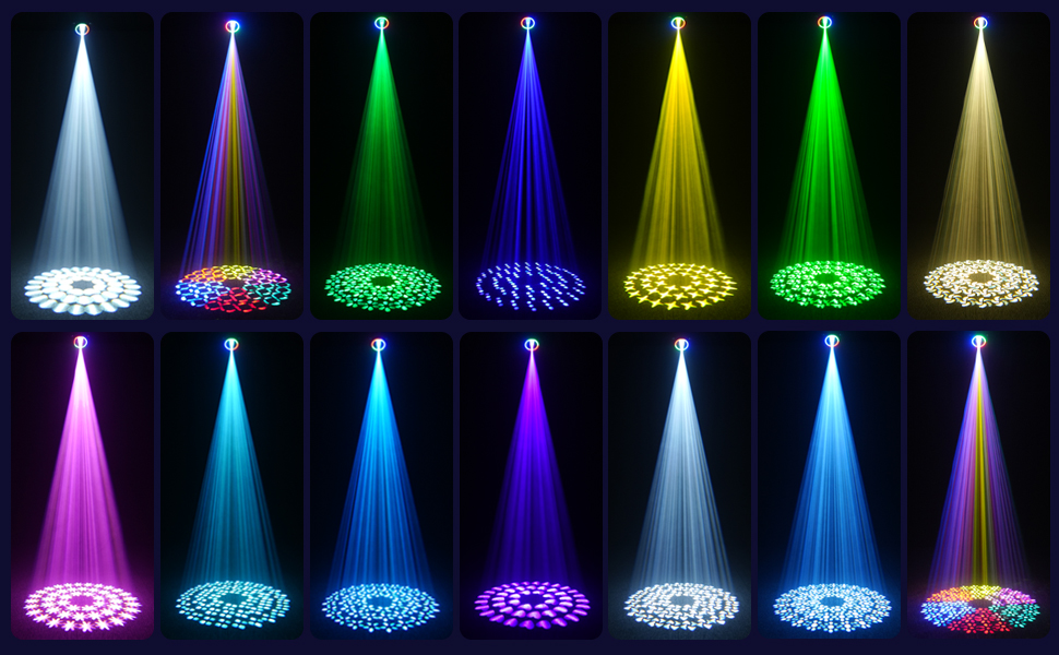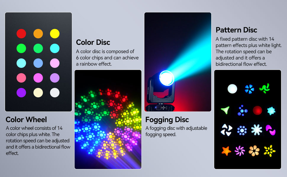 Pattern Disc: One fixed pattern disc, 14 pattern effects + white light, adjustable rotation speed, bidirectional flowing effect.