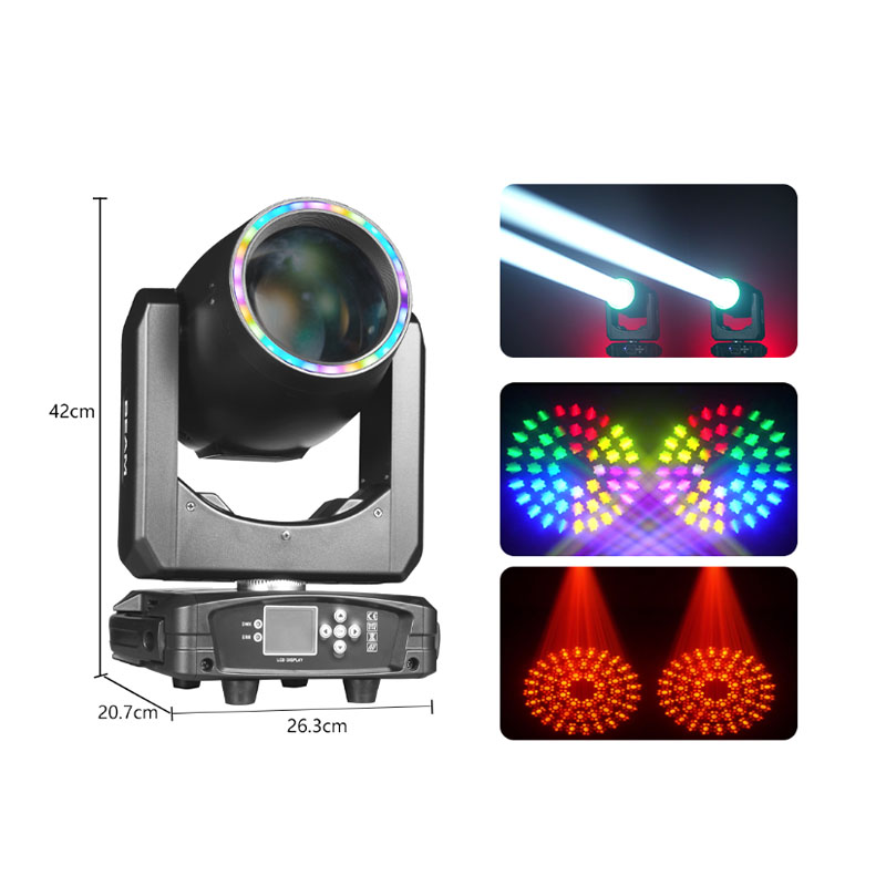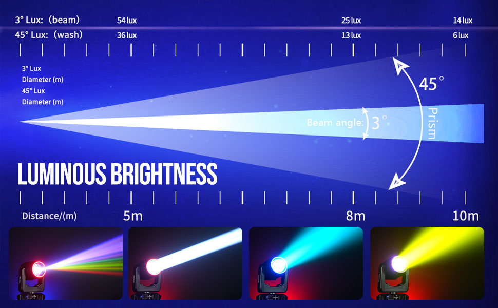 Focusing: Lens group optical system, motorized focusing, linear focusing with a beam angle of 0-4°, 0-100% mechanical dimming from near to far.