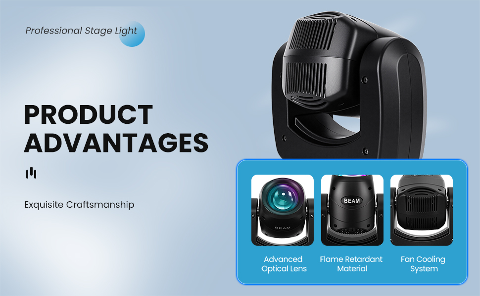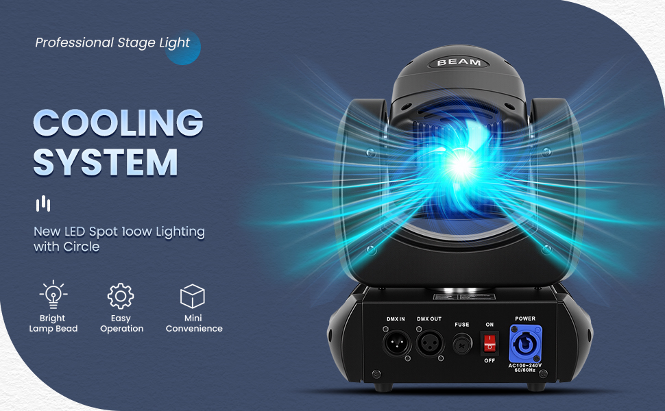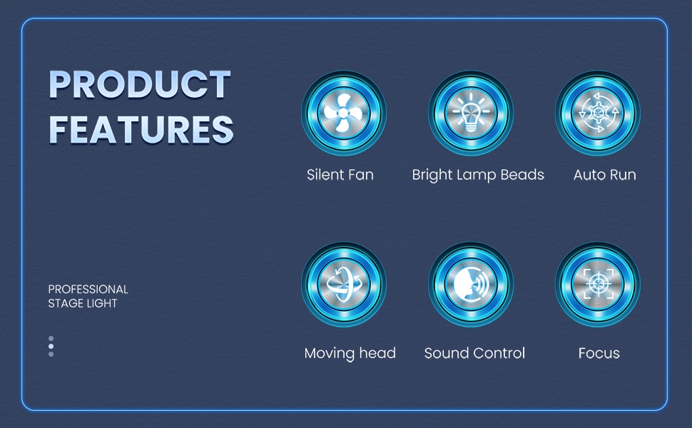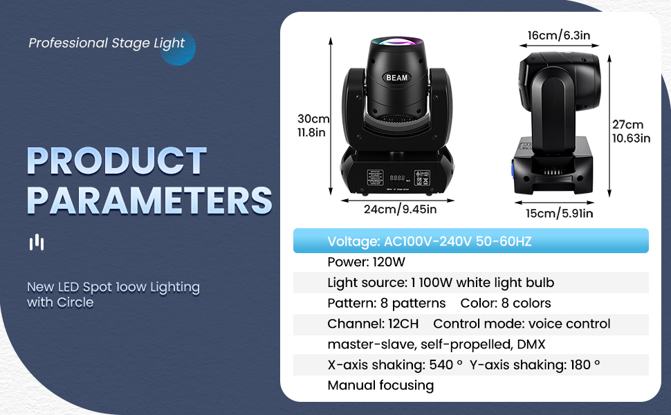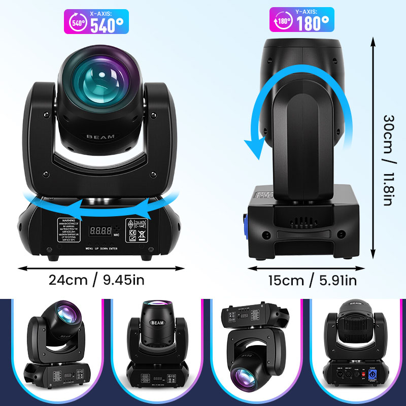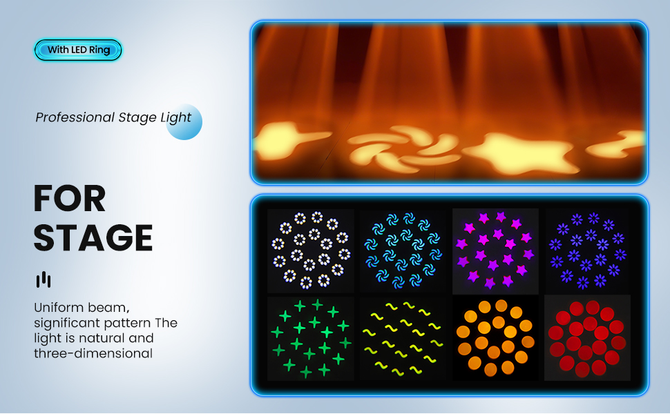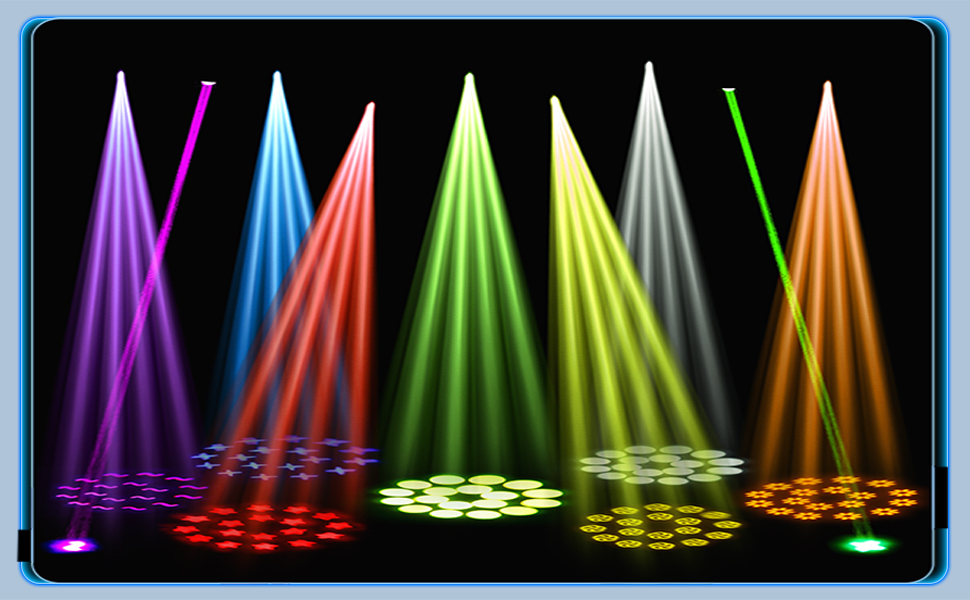 Pattern Wheel: One fixed pattern wheel consists of 7 pattern effects + white light, adjustable rotation speed, flowing effect.